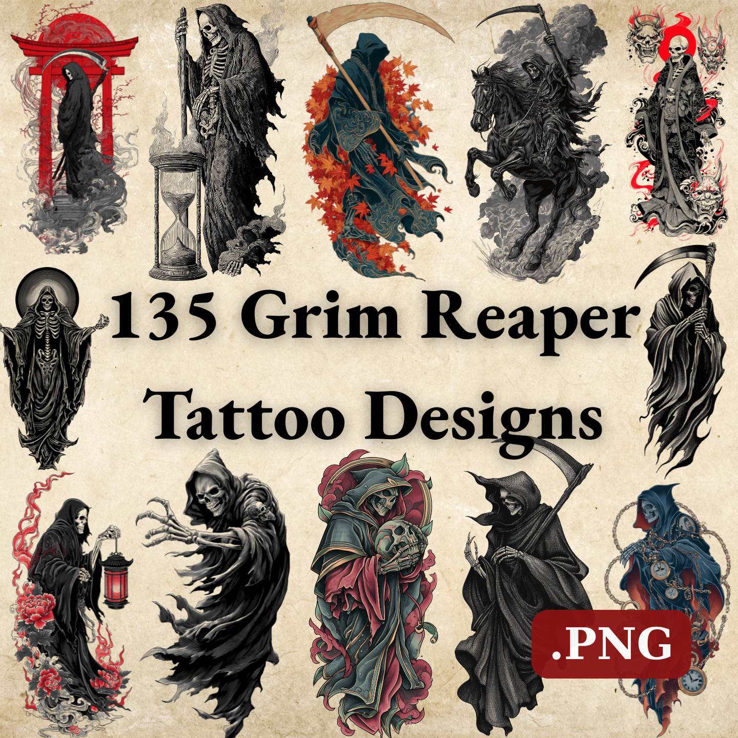 A striking bundle of 135 high-quality Grim Reaper tattoo design files