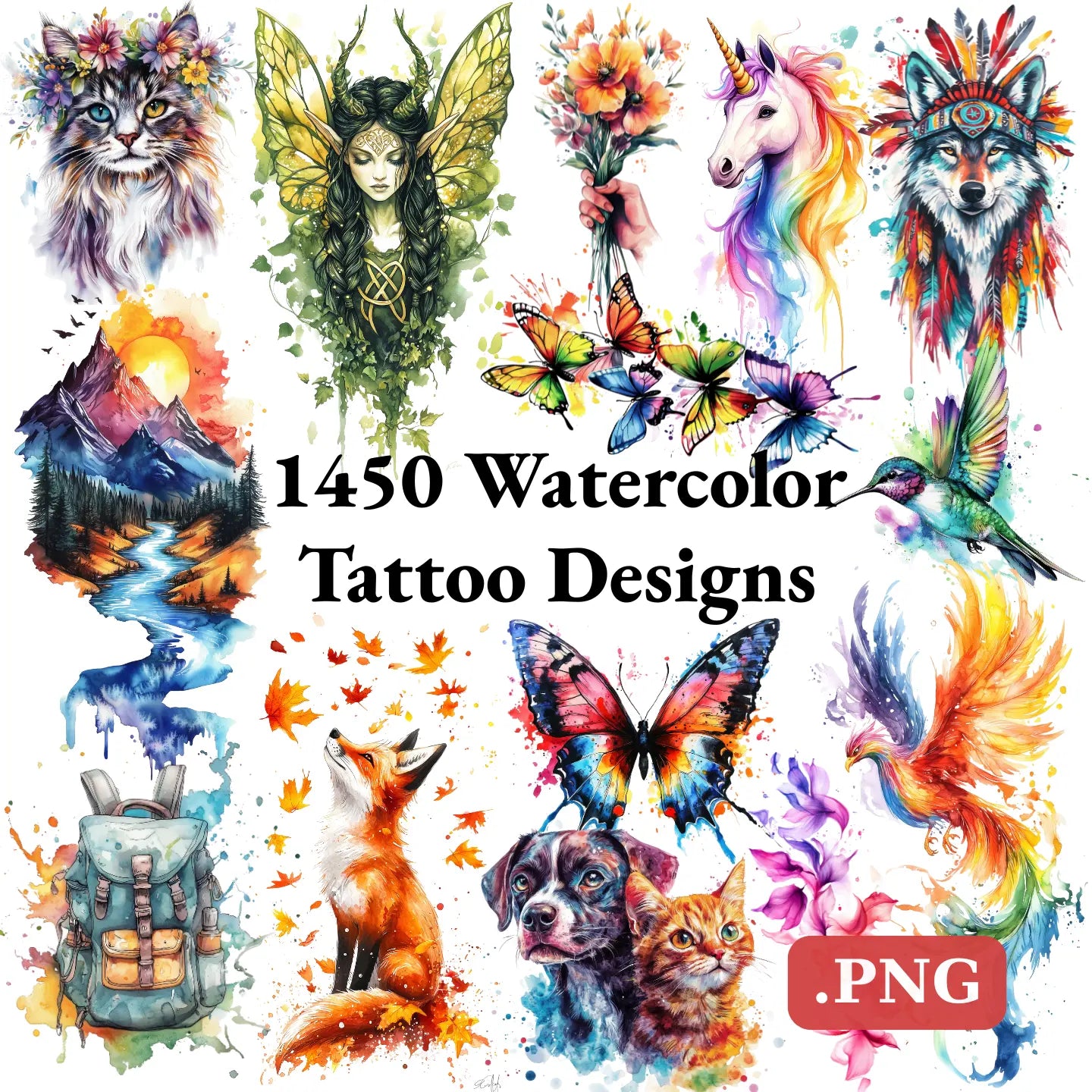 Explore a vibrant and artistic collection of 1450 high-resolution PNG tattoo designs in the stunning Watercolor style. Each design is crafted in rich color with fluid brush textures, making this bundle ideal for tattoo artists, illustrators, and creative professionals.